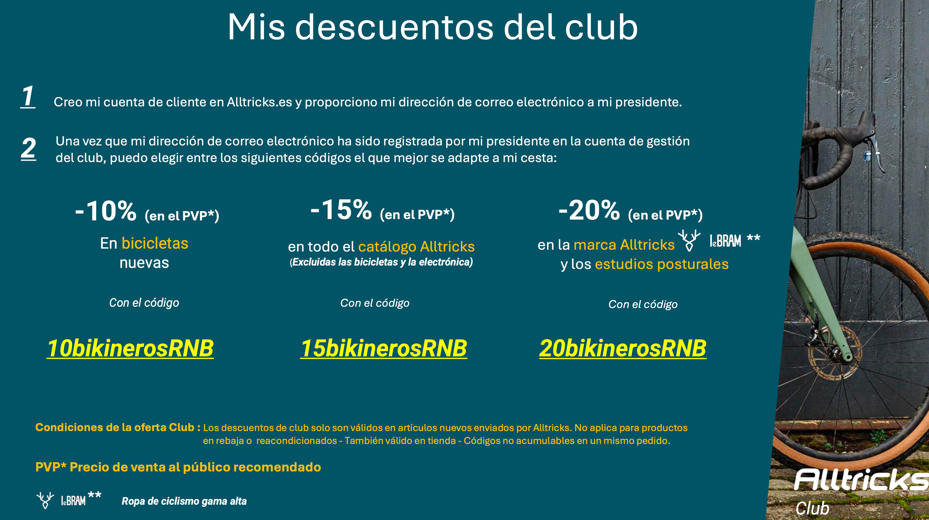 -Código: "15bikinerosRNB" para un 15 % de descuento (no acumulable) sobre el precio de venta al público recomendado de todo el catálogo Alltricks(las bicicletas completas y la electrónica quedan excluidas de la oferta)